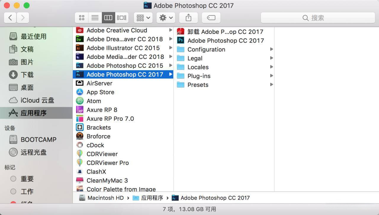 首先我们找到MAC系统PS的Plug-ins目录,它的位置在「应用程序 – Adobe Photoshop cc…」的目录下。
