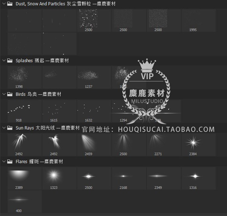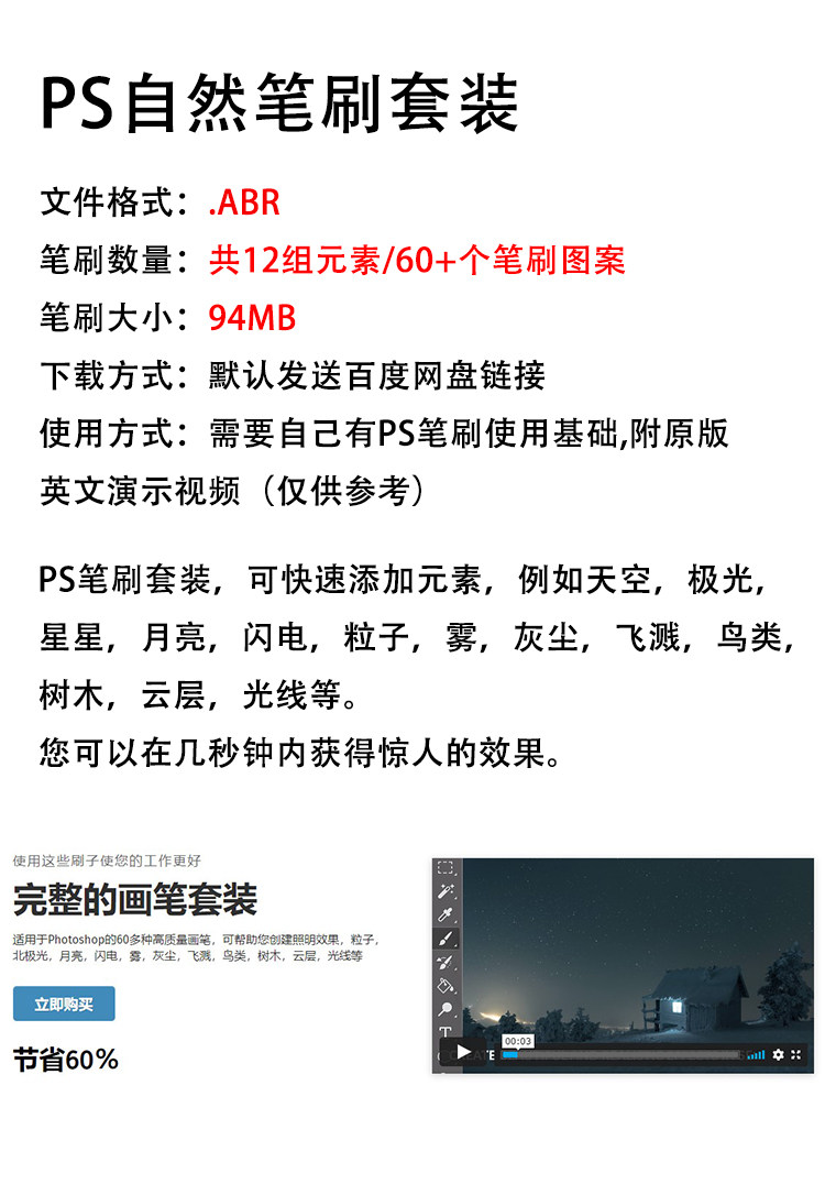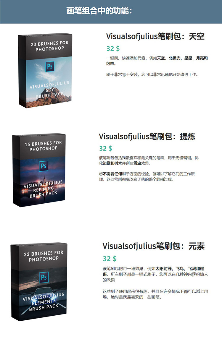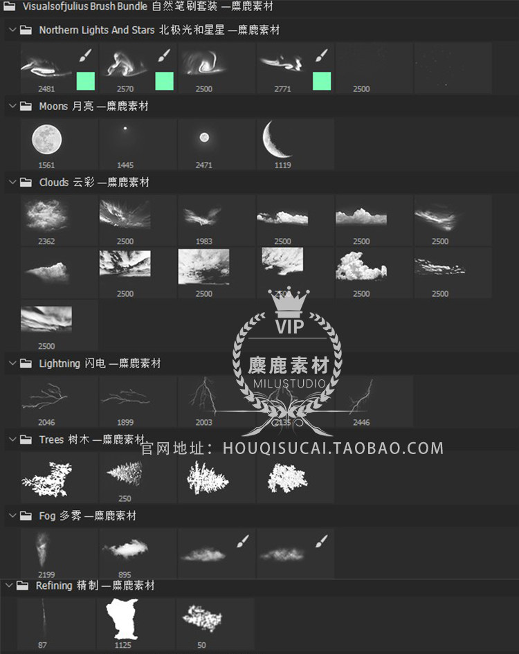 VisualsofJulius – Brush Bundle是一套适用于Photoshop的60多种高质量笔刷,可帮助您创建照明效果,粒子,北极光,月亮,闪电,雾,灰尘,耀斑,镜头光晕,飞溅,鸟类,树木,云层,光线等,所有笔刷都是一键式效果,您可以在几秒钟内获得惊人的效果.