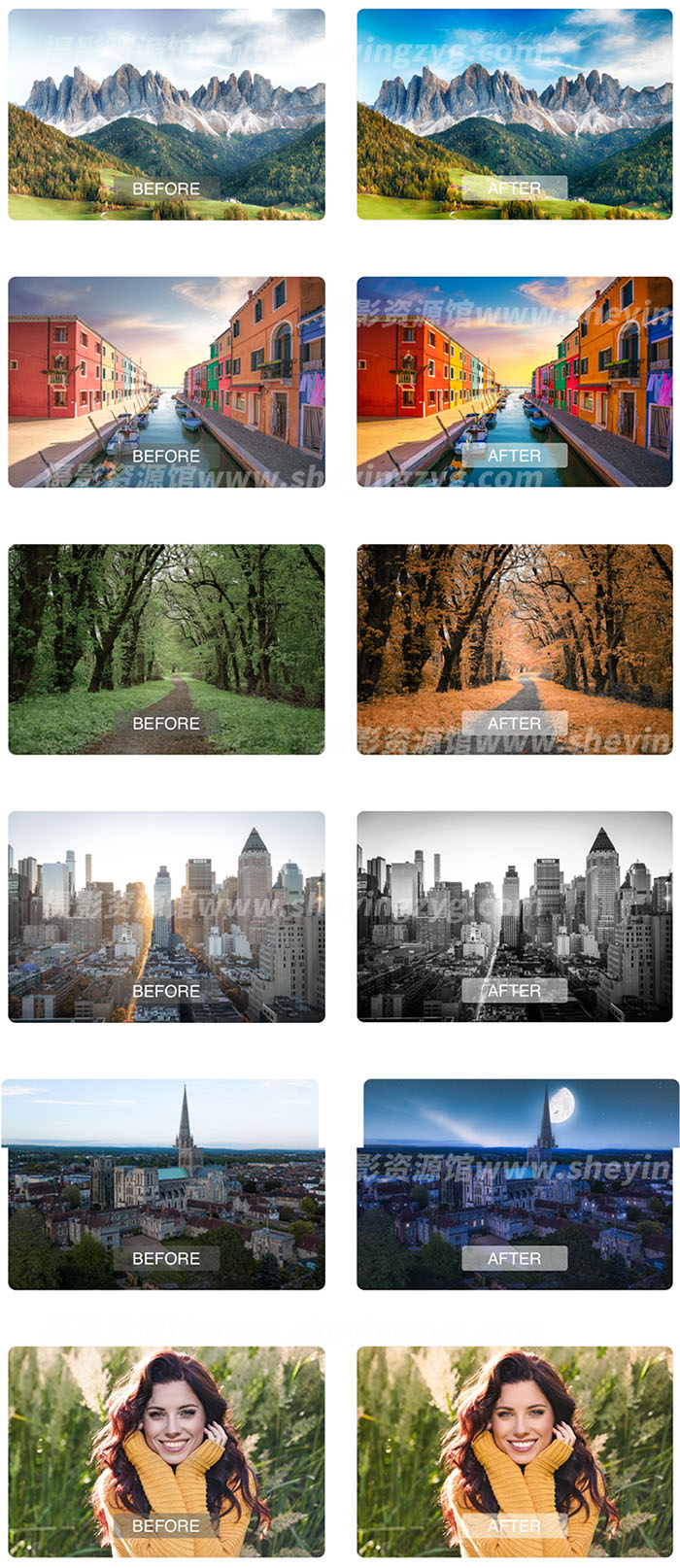 包含效果:基础、风景、黑白、肖像、戏剧、日夜、颜色、气氛、复古、天空