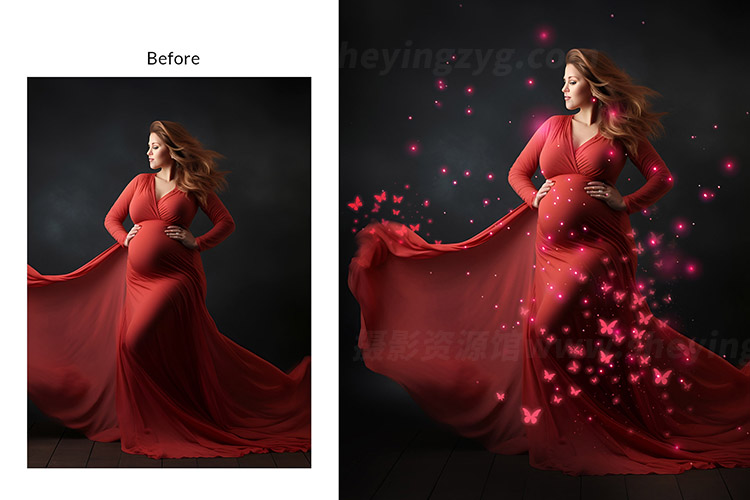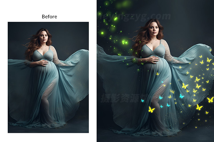 孕妇叠加魔法灯和散景叠加,蝴蝶和萤火虫闪耀孕妇灯工作室 Photoshop PNG 叠加,魔法灯