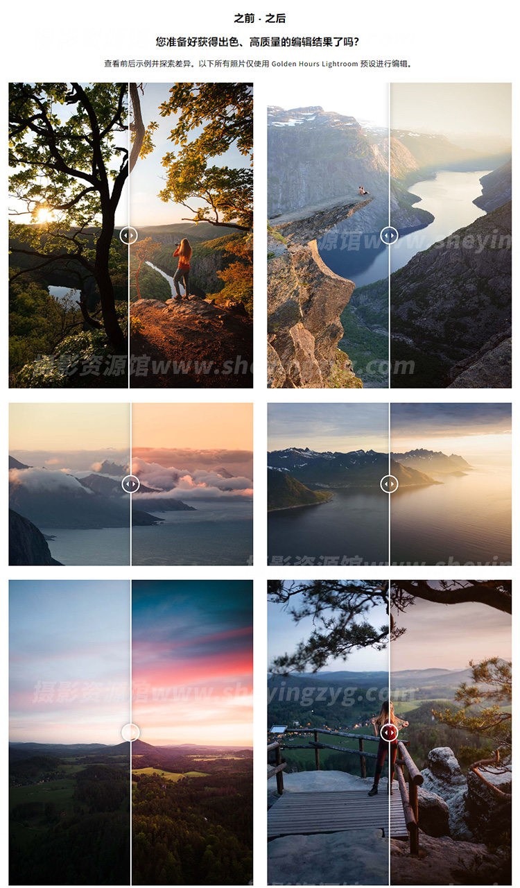 在黄金时刻拍摄是书籍中最古老的摄影技巧之一。捕捉一天里最好的光线是个免费又快速的方法,能够轻松拍出美丽的照片。虽然有时候,经验或相机设定可能会限制成果。使用甜美日落预设集,为日落照增强暖色调,或是让中午的拍摄添加黄金时刻感。