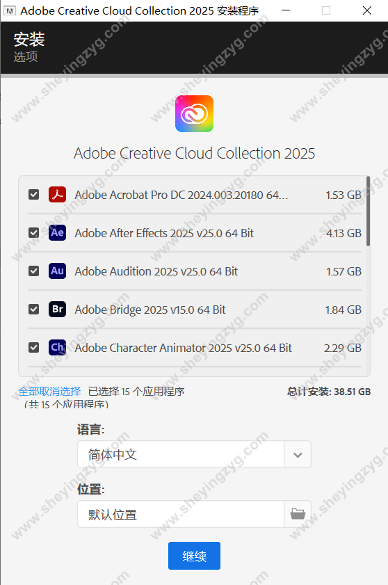 一键安装15套主要Adobe全家桶共计25GB左右,支持自定义安装目录。