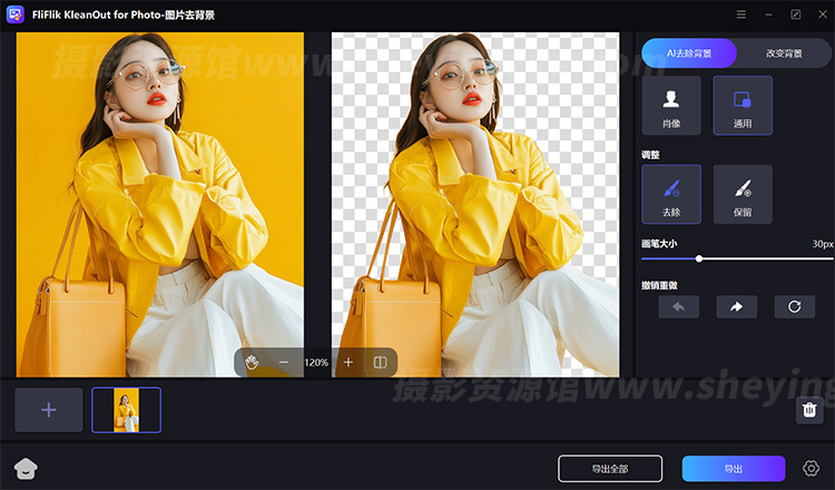 AI移除水印:FliFlik KleanOut for Photo 支持AI算法引擎,能够精准识别和删除照片中的文本水印、图像水印等内容,同时保持图像的原始清晰度和质量。