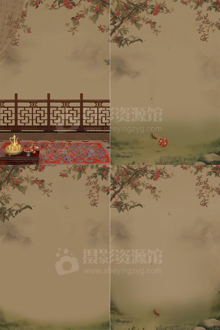 马体国风儿童亲子全家福写真照古风长安荔枝工笔画素材PSD模板