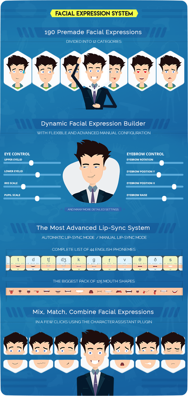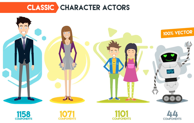 - 包含男性/女性/儿童/机器人4种角色人物,165种男性服装搭配+151种女性服装+119种儿童服装+108组面部表情动画