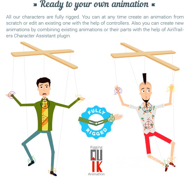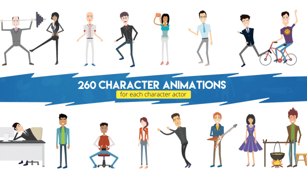 - 131组男性动作+70个女性/儿童动作+21个机器人动作动画,所有的角色都已经通过DUIK绑定好了,可以自己制作动画