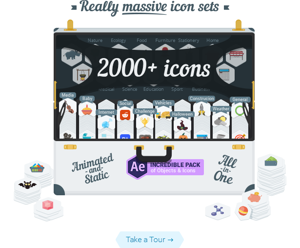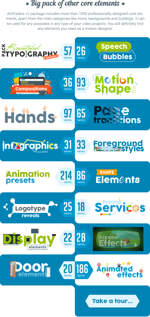- 1141个icon图标动画+57个文字排版+26个对话框气泡+35个元素合成动画+93个图形元素+63个手势动画+65个画面转场+61个图表信息图+33个前景样式+43个运动预设+86个图形动画+24个Logo展示+18个宣传小元素+22个电脑元素+172个建筑楼房