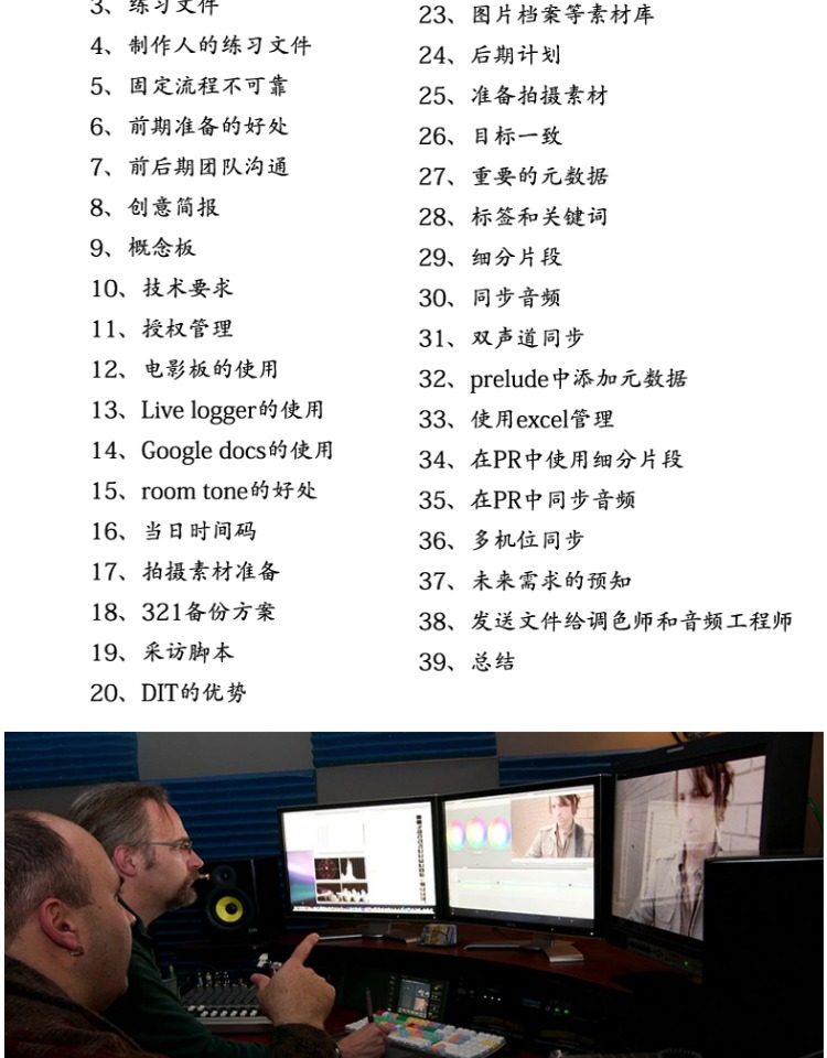 本套教程是制作人Amy 与剪辑师Luisa共同制作的,Amy是一名制片人、编剧兼导演,以制作广告片和剧情电影起家,然后转向制作非虚构类作品,现在主要制作大型节目,还制作很多移动端的视频(微电影),Luisa从事剪辑工作30年,剪辑了很多广告片、纪录片和宣传片等等,目前的工作偏向教育,更加关注制作领域。教程内容很多,有很多的后期制作环节的讲解,从制作到后期,就是本教程的核心内容。两人都制作过上百个视频项目 ,会为大家提供很多实用的技巧和知识,让你的工作更加高效,有创意。如今我们需要在拍摄前,就把团队整合到一起,为后期做好计划,学习相互沟通,在拍摄和后期,都要带着剪辑的思维去工作,所以这套教程是电影人必看的进阶教程。