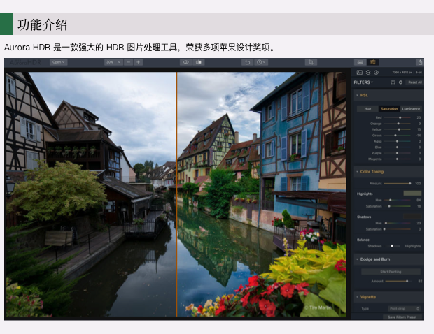 Aurora HDR Pro 可以分图层,支持HDR降噪,曲线,可以制作特殊的“发光”的效果,以及“hdrness”调整,颜色过滤器等功能,支持RAW格式、JPG、TIFF、PSD格式,还有许多其他的功能和工具。该软件不仅易于使用,功能上也非常强大。